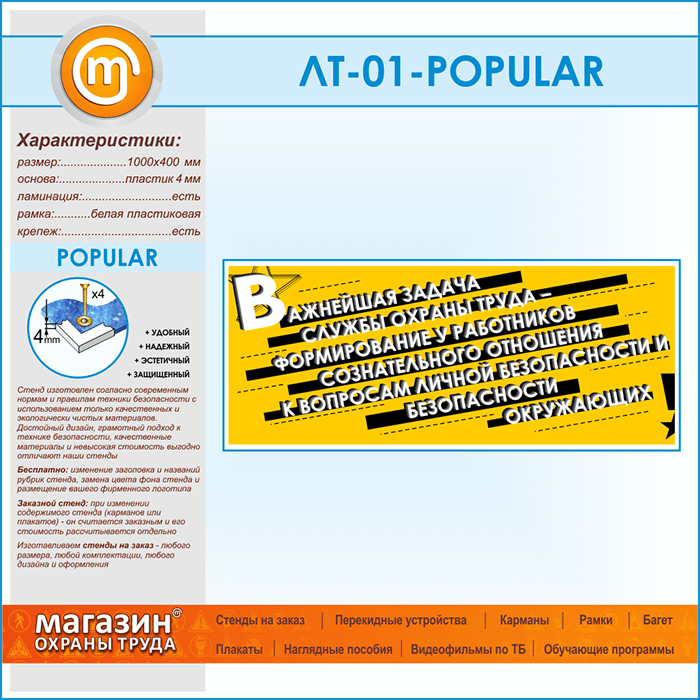 Стенды с лозунгами по охране труда и технике безопасности используются на производственных участках, при оформлении учебных классов и кабинетов охраны труда, а так же служат ярким и красочным напоминанием о технике безопасности