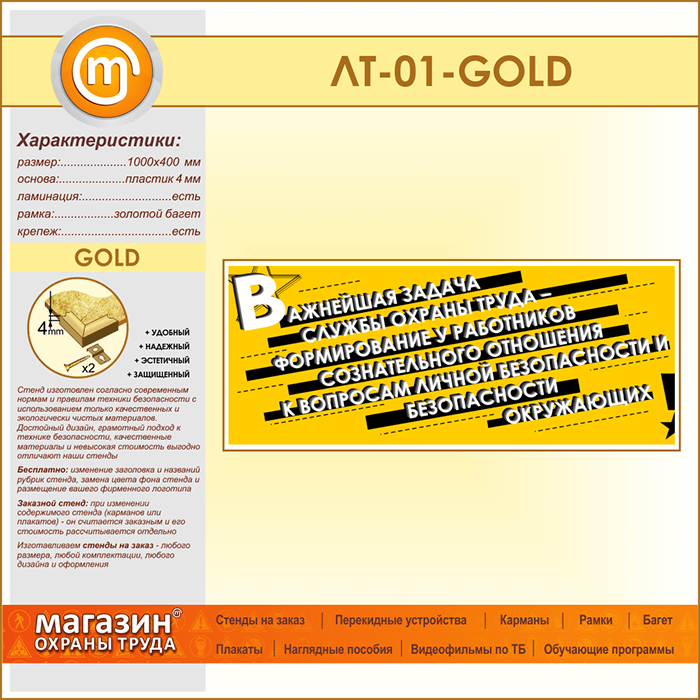 Подводя итог вышесказанному, к главным преимуществам данного стенда, изготовленного на пластике 4 мм в золотом алюминиевом багете можно отнести шикарный внешний вид, использование качественных и экологически безопасных материалов, высокие эксплуатационные свойства, качественный дизайн, а также соответствие современным нормам и правилам техники безопасности