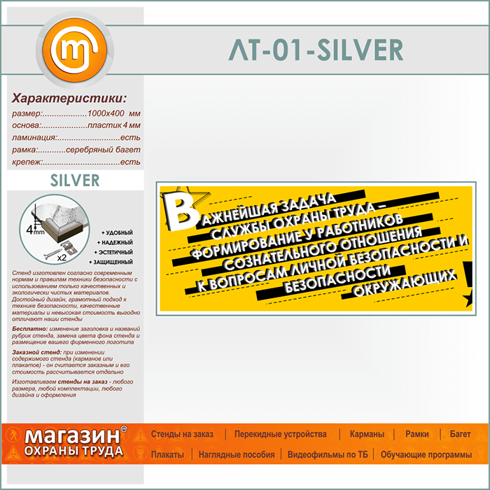 Подводя итог вышесказанному, к главным преимуществам данного стенда, изготовленного на пластике 4 мм в серебряном алюминиевом багете можно отнести шикарный внешний вид, использование качественных и экологически безопасных материалов, высокие эксплуатационные свойства, качественный дизайн, а также соответствие современным нормам и правилам техники безопасности