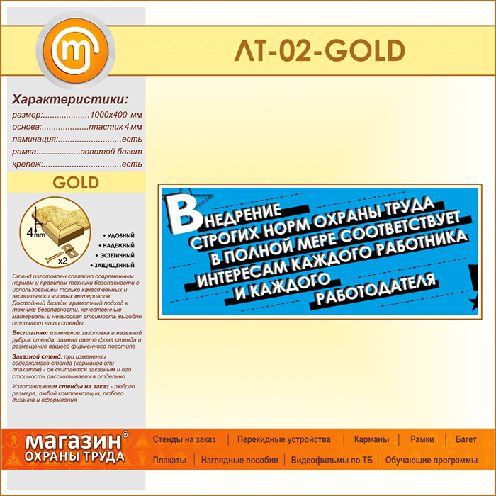 Подводя итог вышесказанному, к главным преимуществам данного стенда, изготовленного на пластике 4 мм в золотом алюминиевом багете можно отнести шикарный внешний вид, использование качественных и экологически безопасных материалов, высокие эксплуатационные свойства, качественный дизайн, а также соответствие современным нормам и правилам техники безопасности