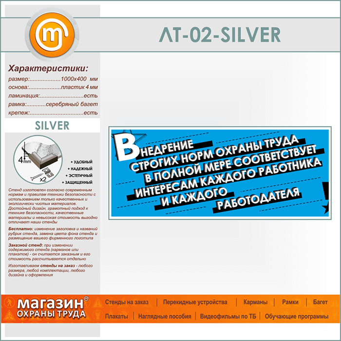 Подводя итог вышесказанному, к главным преимуществам данного стенда, изготовленного на пластике 4 мм в серебряном алюминиевом багете можно отнести шикарный внешний вид, использование качественных и экологически безопасных материалов, высокие эксплуатационные свойства, качественный дизайн, а также соответствие современным нормам и правилам техники безопасности