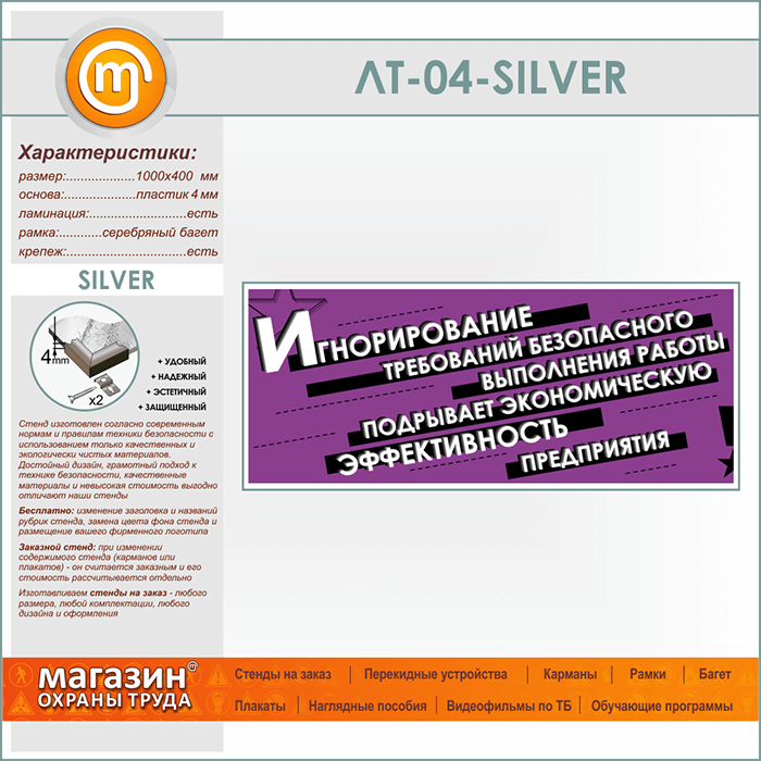 Подводя итог вышесказанному, к главным преимуществам данного стенда, изготовленного на пластике 4 мм в серебряном алюминиевом багете можно отнести шикарный внешний вид, использование качественных и экологически безопасных материалов, высокие эксплуатационные свойства, качественный дизайн, а также соответствие современным нормам и правилам техники безопасности