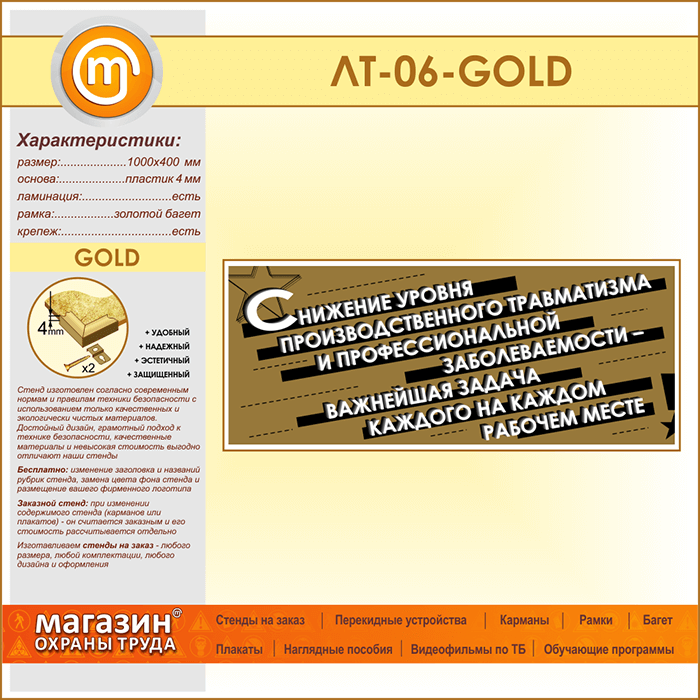 Подводя итог вышесказанному, к главным преимуществам данного стенда, изготовленного на пластике 4 мм в золотом алюминиевом багете можно отнести шикарный внешний вид, использование качественных и экологически безопасных материалов, высокие эксплуатационные свойства, качественный дизайн, а также соответствие современным нормам и правилам техники безопасности