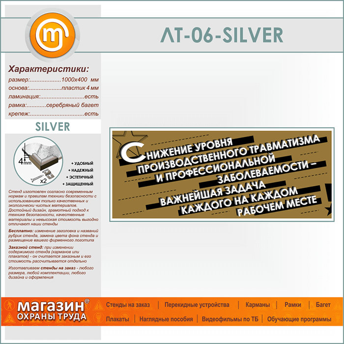Подводя итог вышесказанному, к главным преимуществам данного стенда, изготовленного на пластике 4 мм в серебряном алюминиевом багете можно отнести шикарный внешний вид, использование качественных и экологически безопасных материалов, высокие эксплуатационные свойства, качественный дизайн, а также соответствие современным нормам и правилам техники безопасности