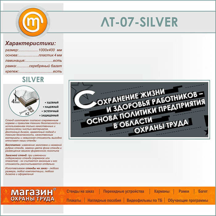 Подводя итог вышесказанному, к главным преимуществам данного стенда, изготовленного на пластике 4 мм в серебряном алюминиевом багете можно отнести шикарный внешний вид, использование качественных и экологически безопасных материалов, высокие эксплуатационные свойства, качественный дизайн, а также соответствие современным нормам и правилам техники безопасности