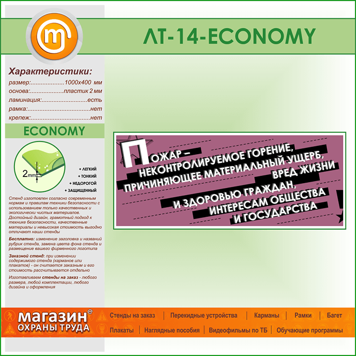 Предлагаем Вашему вниманию стенд с лозунгом «Пожар — неконтролируемое горение, причиняющее материальный ущерб, вред жизни и здоровью граждан, интересам общества и государства»