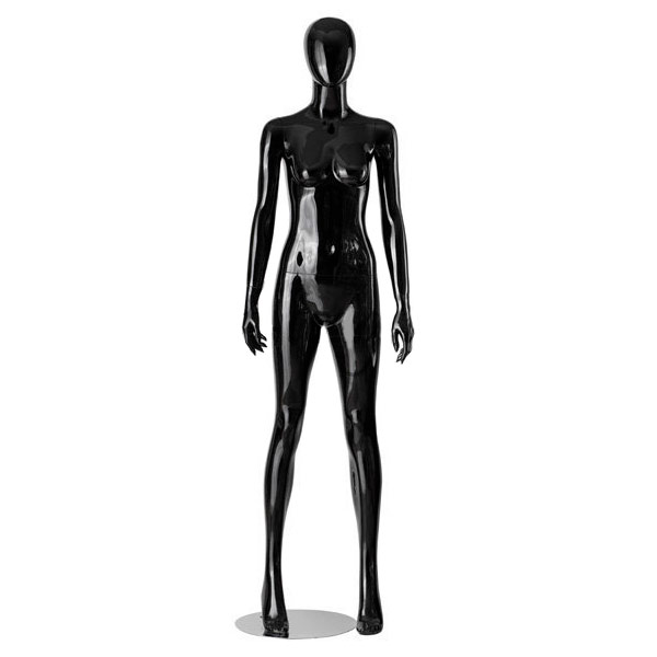 Манекен женский в полный рост стилизованный, безликий. Изготовлен из твердого пластика глянцевого черного цвета без изображениея лица. Рост женского манекена составляет около 180 см
