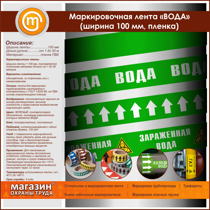 Маркировочная самоклеящаяся лента «ВОДА» имеет ЗЕЛЕНЫЙ цвет и соответствует обозначению, основным компонентом которых является вода. Ширина ленты – 100 мм, поставляется погонными метрами длиной от 1 до 50 метров. Изготавливается одноцветной, со стрелками или с наименованием