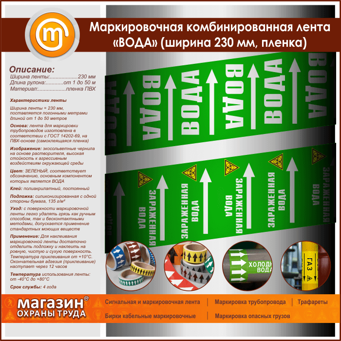 Маркировочная комбинированная самоклеящаяся лента «ВОДА» имеет ЗЕЛЕНЫЙ цвет и соответствует обозначению, основным компонентом которых является вода. Ширина ленты – 230 мм, поставляется погонными метрами длиной от 1 до 50 метров. На ленте одновременно указывается наименование вещества и направление его движения