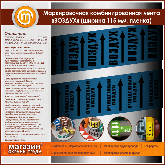 Маркировочная комбинированная самоклеящаяся лента «ВОЗДУХ» с ламинированием (толщиной 80 мкм) имеет СВЕТЛО-СИНИЙ цвет и применяется для маркировки трубопроводов и воздуховодов, транспортирующих воздух. Ширина ленты – 115 мм, поставляется погонными метрами длиной от 1 до 50 метров. На ленте одновременно указывается наименование вещества и направление его движения