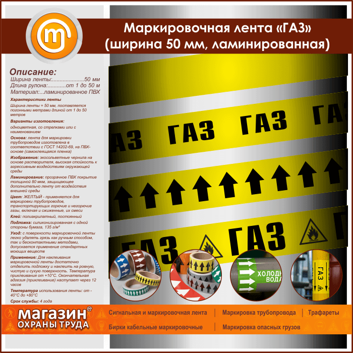Маркировочная самоклеящаяся лента «ГАЗ» имеет ЖЕЛТЫЙ цвет и применяется для маркировки трубопроводов, транспортирующих горючие и негорючие газы, включая и сжиженные, а также их смеси. Ширина ленты – 50 мм, поставляется погонными метрами длиной от 1 до 50 метров. Изготавливается одноцветной, со стрелками или с наименованием