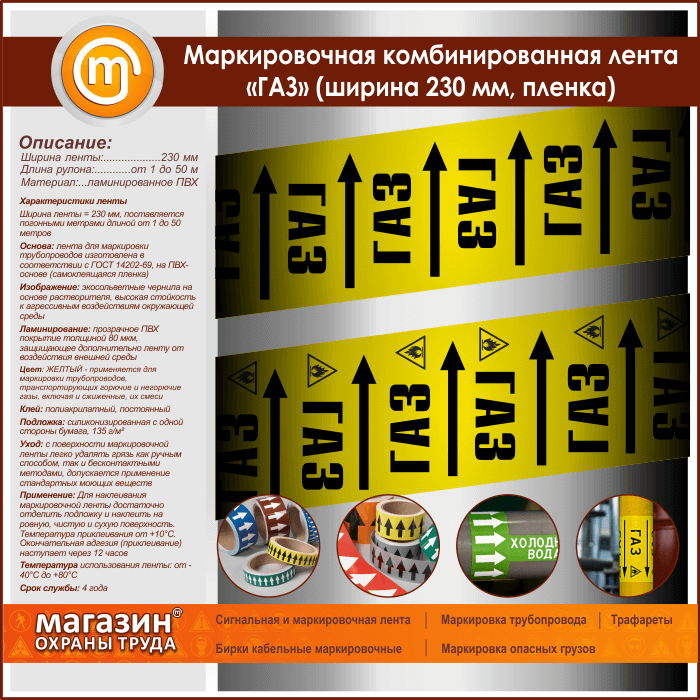 Маркировочная комбинированная самоклеящаяся лента «ГАЗ» имеет ЖЕЛТЫЙ цвет и применяется для маркировки трубопроводов, транспортирующих горючие и негорючие газы, включая и сжиженные, а также их смеси. Ширина ленты – 230 мм, поставляется погонными метрами длиной от 1 до 50 метров. На ленте одновременно указывается наименование вещества и направление его движения