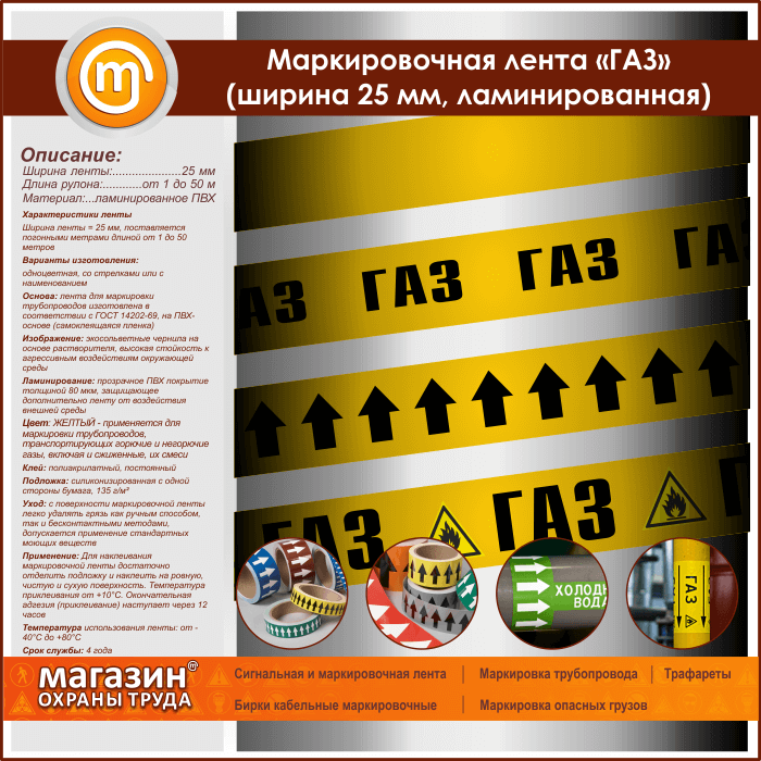 Маркировочная самоклеящаяся лента «ГАЗ» с ламинированием (толщиной 80 мкм) имеет ЖЕЛТЫЙ цвет и применяется для маркировки трубопроводов, транспортирующих горючие и негорючие газы, включая и сжиженные, а также их смеси. Ширина ленты – 25 мм, поставляется погонными метрами длиной от 1 до 50 метров. Изготавливается одноцветной, со стрелками или с наименованием