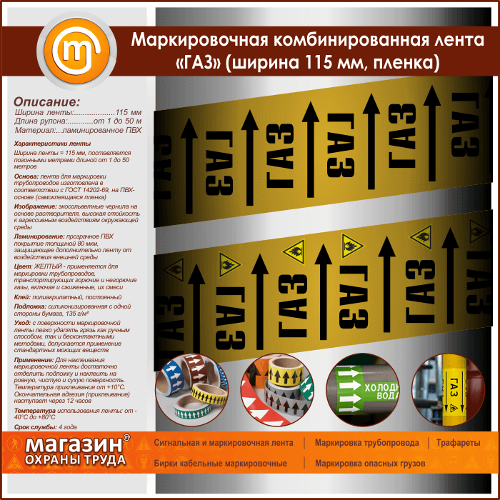 Маркировочная комбинированная самоклеящаяся лента «ГАЗ» с ламинированием (толщиной 80 мкм) имеет ЖЕЛТЫЙ цвет и применяется для маркировки трубопроводов, транспортирующих горючие и негорючие газы, включая и сжиженные, а также их смеси. Ширина ленты – 115 мм, поставляется погонными метрами длиной от 1 до 50 метров. На ленте одновременно указывается наименование вещества и направление его движения