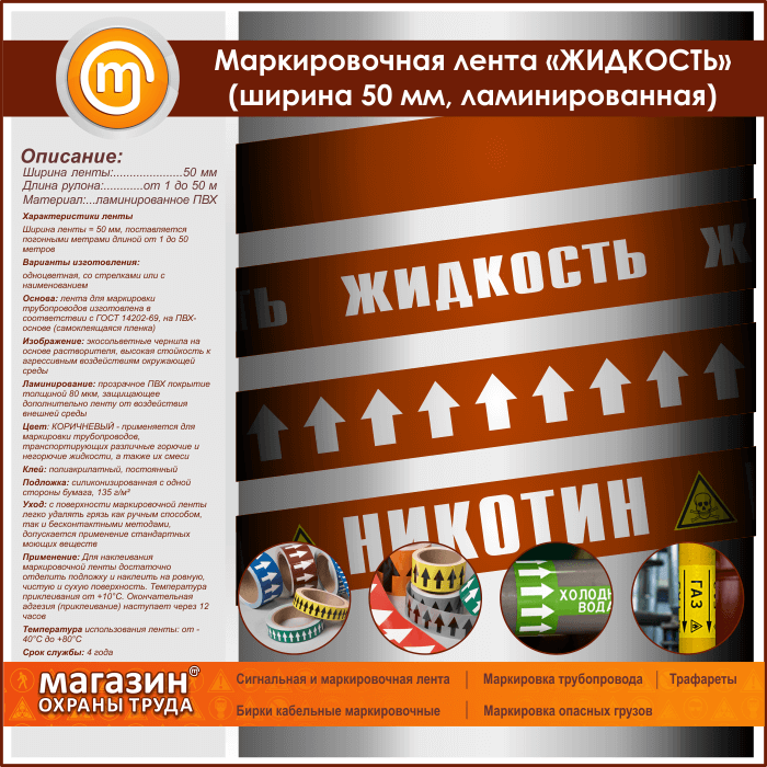 Маркировочная самоклеящаяся лента «ЖИДКОСТЬ» имеет КОРИЧНЕВЫЙ цвет и применяется для маркировки трубопроводов, транспортирующих различные горючие и негорючие жидкости, а также их смеси. Ширина ленты – 50 мм, поставляется погонными метрами длиной от 1 до 50 метров. Изготавливается одноцветной, со стрелками или с наименованием