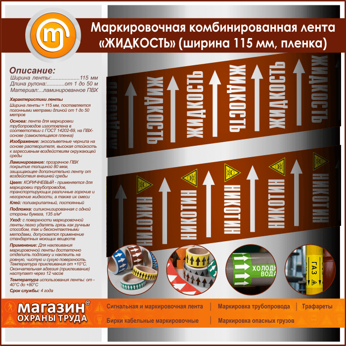 Маркировочная комбинированная самоклеящаяся лента «ЖИДКОСТЬ» имеет КОРИЧНЕВЫЙ цвет и применяется для маркировки трубопроводов, транспортирующих различные горючие и негорючие жидкости, а также их смеси. Ширина ленты – 115 мм, поставляется погонными метрами длиной от 1 до 50 метров. На ленте одновременно указывается наименование вещества и направление его движения