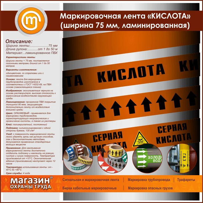 Маркировочная самоклеящаяся лента «КИСЛОТА» с ламинированием (толщиной 80 мкм) имеет ОРАНЖЕВЫЙ цвет и применяется для маркировки трубопроводов, транспортирующих неорганические и органические кислоты, а также их растворы. Ширина ленты – 75 мм, поставляется погонными метрами длиной от 1 до 50 метров. Изготавливается одноцветной, со стрелками или с наименованием