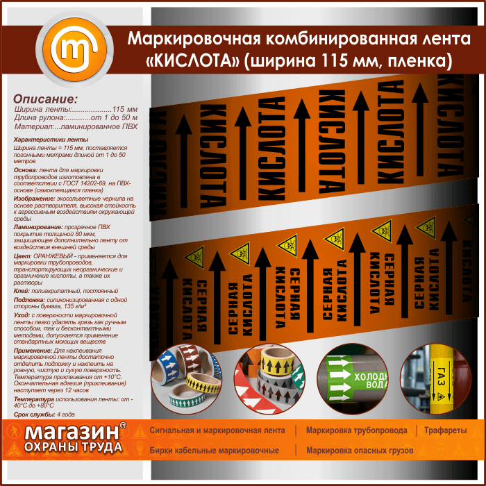 Маркировочная комбинированная самоклеящаяся лента «КИСЛОТА» с ламинированием (толщиной 80 мкм) имеет ОРАНЖЕВЫЙ цвет и применяется для маркировки трубопроводов, транспортирующих неорганические и органические кислоты, а также их растворы. Ширина ленты – 115 мм, поставляется погонными метрами длиной от 1 до 50 метров. На ленте одновременно указывается наименование вещества и направление его движения