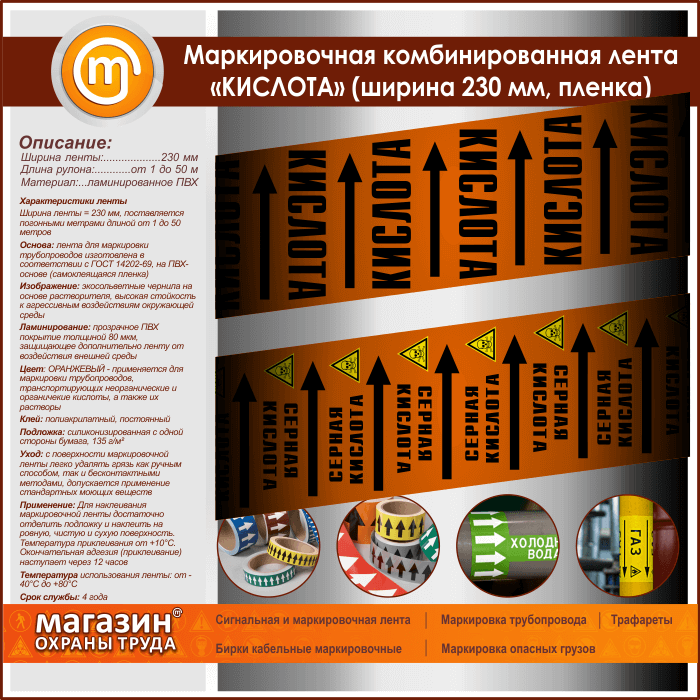 Маркировочная комбинированная самоклеящаяся лента «КИСЛОТА» с ламинированием (толщиной 80 мкм) имеет ОРАНЖЕВЫЙ цвет и применяется для маркировки трубопроводов, транспортирующих неорганические и органические кислоты, а также их растворы. Ширина ленты – 230 мм, поставляется погонными метрами длиной от 1 до 50 метров. На ленте одновременно указывается наименование вещества и направление его движения