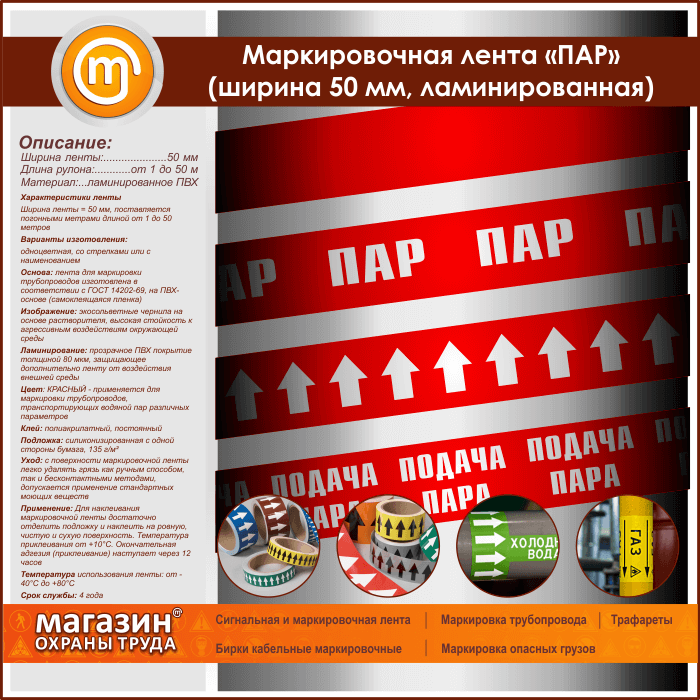 Маркировочная самоклеящаяся лента «ПАР» имеет КРАСНЫЙ цвет и применяется для маркировки трубопроводов, транспортирующих водяной пар различных параметров. Ширина ленты – 50 мм, поставляется погонными метрами длиной от 1 до 50 метров. Изготавливается одноцветной, со стрелками или с наименованием