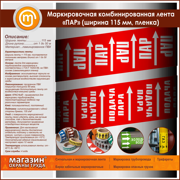 Маркировочная комбинированная самоклеящаяся лента «ПАР» имеет КРАСНЫЙ цвет и применяется для маркировки трубопроводов, транспортирующих водяной пар различных параметров. Ширина ленты – 115 мм, поставляется погонными метрами длиной от 1 до 50 метров. На ленте одновременно указывается наименование вещества и направление его движения