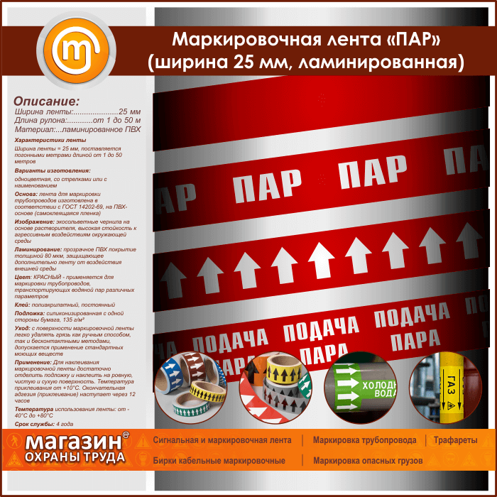 Маркировочная самоклеящаяся лента «ПАР» с ламинированием (толщиной 80 мкм) имеет КРАСНЫЙ цвет и применяется для маркировки трубопроводов, транспортирующих водяной пар различных параметров. Ширина ленты – 25 мм, поставляется погонными метрами длиной от 1 до 50 метров. Изготавливается одноцветной, со стрелками или с наименованием