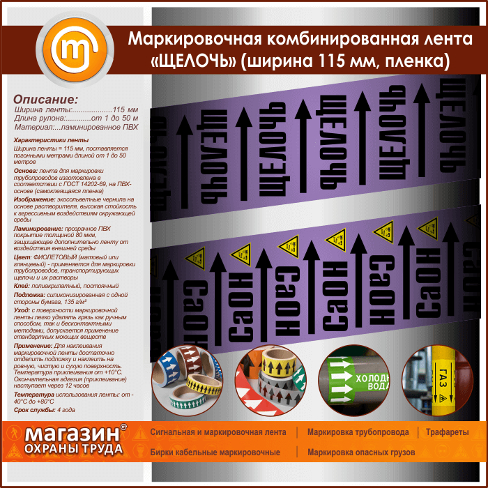 Маркировочная комбинированная самоклеящаяся лента «ЩЕЛОЧЬ» имеет ФИОЛЕТОВЫЙ цвет и применяется для маркировки трубопроводов, транспортирующих щелочи и их растворы. Ширина ленты – 115 мм, поставляется погонными метрами длиной от 1 до 50 метров. На ленте одновременно указывается наименование вещества и направление его движения