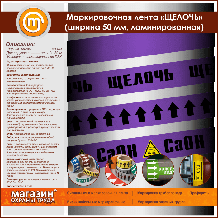 Маркировочная самоклеящаяся лента «ЩЕЛОЧЬ» с ламинированием (толщиной 80 мкм) имеет ФИОЛЕТОВЫЙ цвет и применяется для маркировки трубопроводов, транспортирующих щелочи и их растворы. Ширина ленты – 50 мм, поставляется погонными метрами длиной от 1 до 50 метров.
