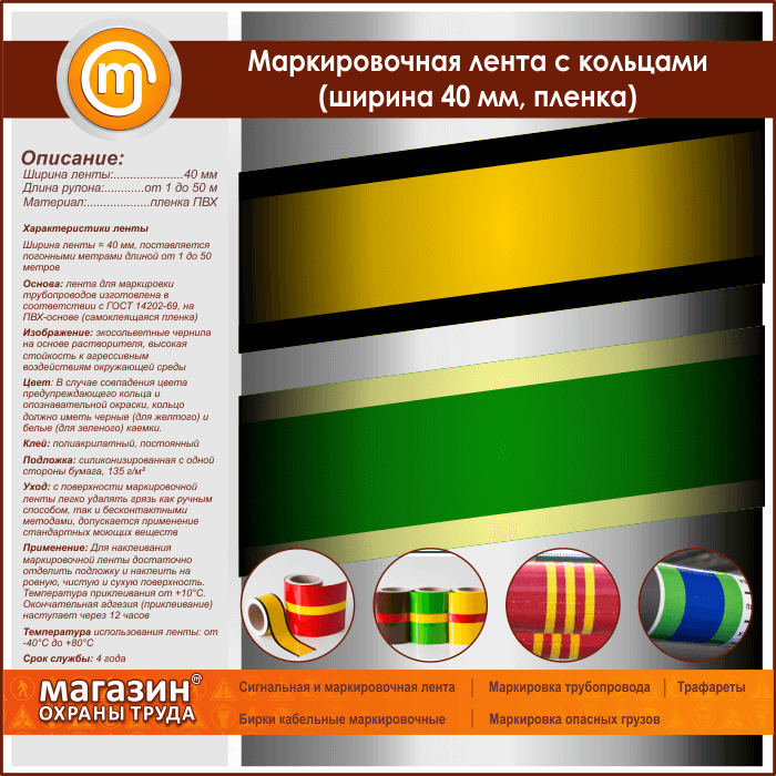 Маркировочная самоклеящаяся лента с кольцами имеет ширину в 40 мм и поставляется погонными метрами длиной от 1 до 50 м. Применяя наши готовые ленты, вы значительно упросите работу по маркировке трубопроводов