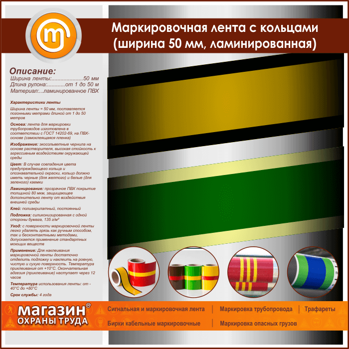 Маркировочная самоклеящаяся лента с кольцами имеет ширину в 50 мм и поставляется погонными метрами длиной от 1 до 50 м. Поверхность ленты заламинирована прозрачным ПВХ-покрытием толщиной 80 мкм, обеспечивающим дополнительную защиту от воздействия агрессивной внешней среды. Применяя наши готовые ленты, вы значительно упросите работу по маркировке трубопроводов
