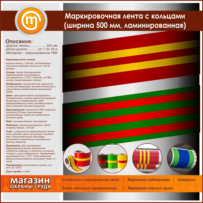 Маркировочная самоклеящаяся лента с кольцами имеет ширину в 500 мм и поставляется погонными метрами длиной от 1 до 50 м. Поверхность ленты заламинирована прозрачным ПВХ-покрытием толщиной 80 мкм, обеспечивающим дополнительную защиту от воздействия агрессивной внешней среды. Применяя наши готовые ленты, вы значительно упросите работу по маркировке трубопроводов