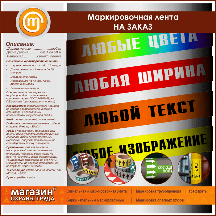 Самоклеящаяся маркировочная лента НА ЗАКАЗ может иметь следующие характеристики: