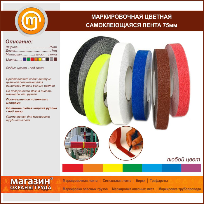 Данная маркировочная лента шириной 75 мм изготавливается из цветной самоклеящейся ПВХ-плёнки