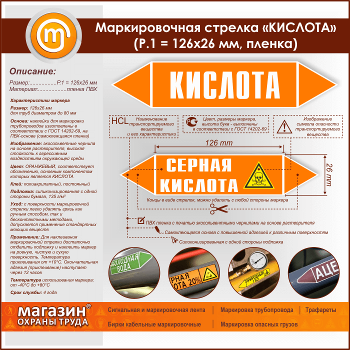 Самоклеящиеся маркеры «КИСЛОТА» имеют ОРАНЖЕВЫЙ цвет, который применяется для маркировки трубопроводов, транспортирующих неорганические и органические кислоты, а также их растворы. Наклейки представлены во всех типоразмерах (Р.1-P.5) и изготовлены в соответствии с ГОСТ 14202-69 на самоклеящейся плёнке с ламинацией и без