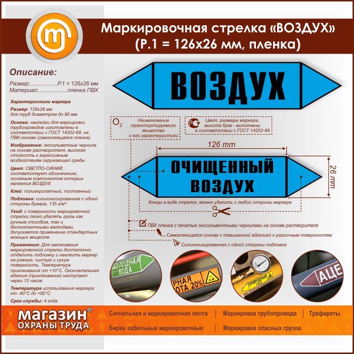 Самоклеящиеся маркеры «ВОЗДУХ» имеют СВЕТЛО-СИНИЙ цвет, который применяется для маркировки трубопроводов и воздуховодов, транспортирующих воздух. Наклейки представлены во всех типоразмерах (Р.1-P.5) и изготовлены в соответствии с ГОСТ 14202-69 на самоклеящейся плёнке с ламинацией и без