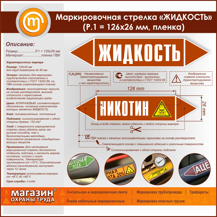 Самоклеящиеся маркеры «ЖИДКОСТЬ» имеют КОРИЧНЕВЫЙ цвет, который применяется для маркировки трубопроводов, транспортирующих различные горючие и негорючие жидкости, а также их смеси. Наклейки представлены во всех типоразмерах (Р.1-P.5) и изготовлены в соответствии с ГОСТ 14202-69 на самоклеящейся плёнке с ламинацией и без