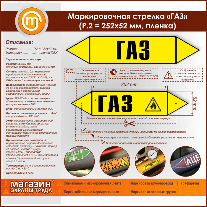 Самоклеящиеся маркеры «ГАЗ» имеют ЖЕЛТЫЙ цвет, который применяется для маркировки трубопроводов, транспортирующих горючие и негорючие газы, включая и сжиженные, а также их смеси. Наклейки размером 252х52 мм (Р.2) предназначены для маркировки труб диаметром от 80 до 160 мм. Изготовлены в соответствии с ГОСТ 14202-69 на самоклеящейся плёнке