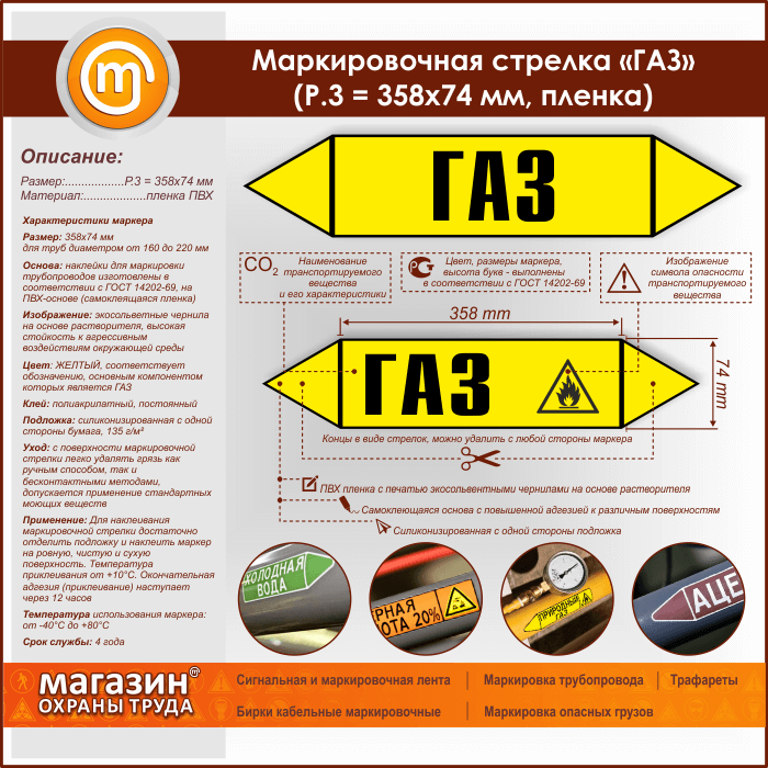 Самоклеящиеся маркеры «ГАЗ» имеют ЖЕЛТЫЙ цвет, который применяется для маркировки трубопроводов, транспортирующих горючие и негорючие газы, включая и сжиженные, а также их смеси. Наклейки размером 358х74 мм (Р.3) предназначены для маркировки труб диаметром от 160 до 220 мм. Изготовлены в соответствии с ГОСТ 14202-69 на самоклеящейся плёнке