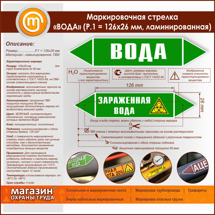 Самоклеящиеся маркеры «ВОДА» имеют ЗЕЛЕНЫЙ цвет, который соответствует обозначению, основным компонентом которых является вода. Наклейки размером 126х26 мм (Р.1) предназначены для маркировки труб диаметром до 80 мм. Изготовлены в соответствии с ГОСТ 14202-69 на самоклеящейся плёнке. Для дополнительной защиты маркера от воздействия агрессивной внешней среды мы производим ламинирование изображения толщиной 80 мкм
