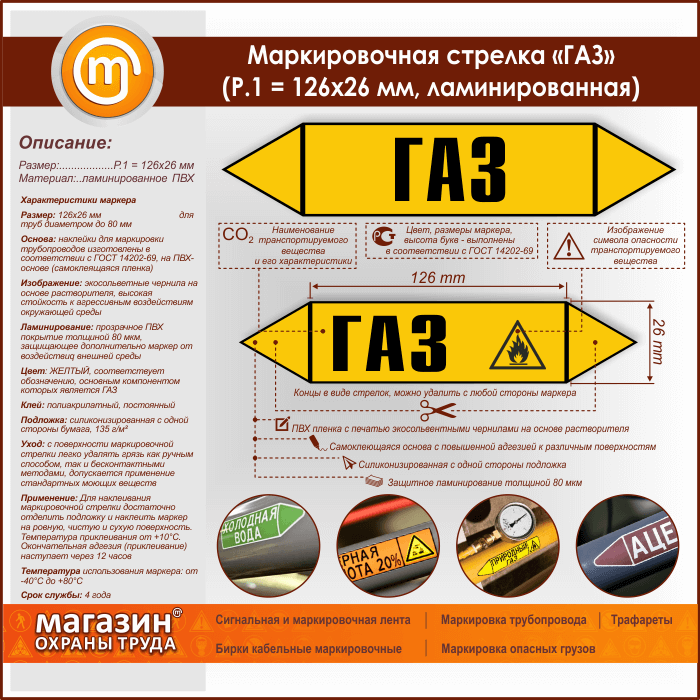 Самоклеящиеся маркеры «ГАЗ» имеют ЖЕЛТЫЙ цвет, который применяется для маркировки трубопроводов, транспортирующих горючие и негорючие газы, включая и сжиженные, а также их смеси. Наклейки размером 126х26 мм (Р.1) предназначены для маркировки труб диаметром до 80 мм. Изготовлены в соответствии с ГОСТ 14202-69 на самоклеящейся плёнке. Для дополнительной защиты маркера от воздействия агрессивной внешней среды мы производим ламинирование изображения толщиной 80 мкм