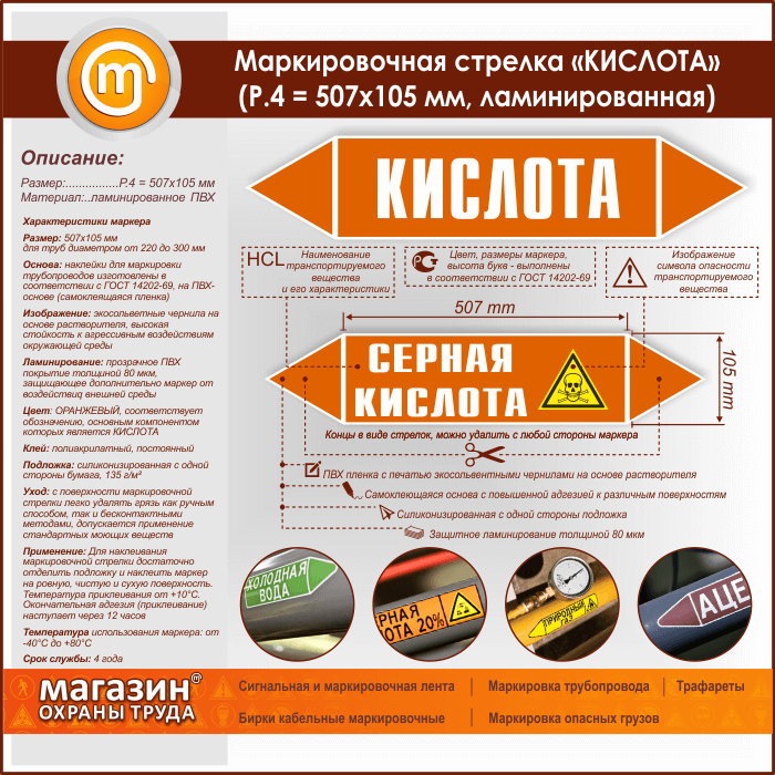 Самоклеящиеся маркеры «КИСЛОТА» имеют ОРАНЖЕВЫЙ цвет, который применяется для маркировки трубопроводов, транспортирующих неорганические и органические кислоты, а также их растворы. Наклейки размером 507х105 мм (Р.4) предназначены для маркировки труб диаметром от 220 до 300 мм. Изготовлены в соответствии с ГОСТ 14202-69 на самоклеящейся плёнке. Для дополнительной защиты маркера от воздействия агрессивной внешней среды мы производим ламинирование изображения толщиной 80 мкм