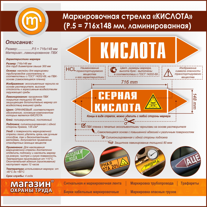 Самоклеящиеся маркеры «КИСЛОТА» имеют ОРАНЖЕВЫЙ цвет, который применяется для маркировки трубопроводов, транспортирующих неорганические и органические кислоты, а также их растворы. Наклейки размером 716х148 мм (Р.5) предназначены для маркировки труб диаметром более 300 мм. Изготовлены в соответствии с ГОСТ 14202-69 на самоклеящейся плёнке. Для дополнительной защиты маркера от воздействия агрессивной внешней среды мы производим ламинирование изображения толщиной 80 мкм