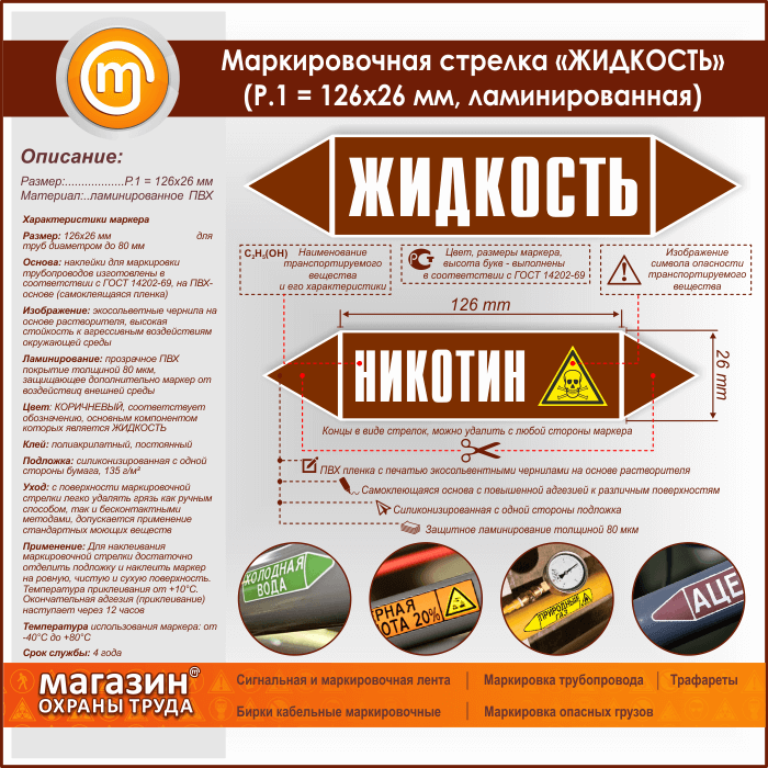 Самоклеящиеся маркеры «ЖИДКОСТЬ» имеют КОРИЧНЕВЫЙ цвет, который применяется для маркировки трубопроводов, транспортирующих различные горючие и негорючие жидкости, а также их смеси. Наклейки размером 126х26 мм (Р.1) предназначены для маркировки труб диаметром до 80 мм. Изготовлены в соответствии с ГОСТ 14202-69 на самоклеящейся плёнке. Для дополнительной защиты маркера от воздействия агрессивной внешней среды мы производим ламинирование изображения толщиной 80 мкм