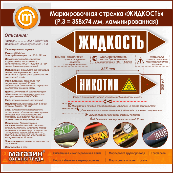 Самоклеящиеся маркеры «ЖИДКОСТЬ» имеют КОРИЧНЕВЫЙ цвет, который применяется для маркировки трубопроводов, транспортирующих различные горючие и негорючие жидкости, а также их смеси. Наклейки размером 358х74 мм (Р.3) предназначены для маркировки труб диаметром от 160 до 220 мм. Изготовлены в соответствии с ГОСТ 14202-69 на самоклеящейся плёнке. Для дополнительной защиты маркера от воздействия агрессивной внешней среды мы производим ламинирование изображения толщиной 80 мкм