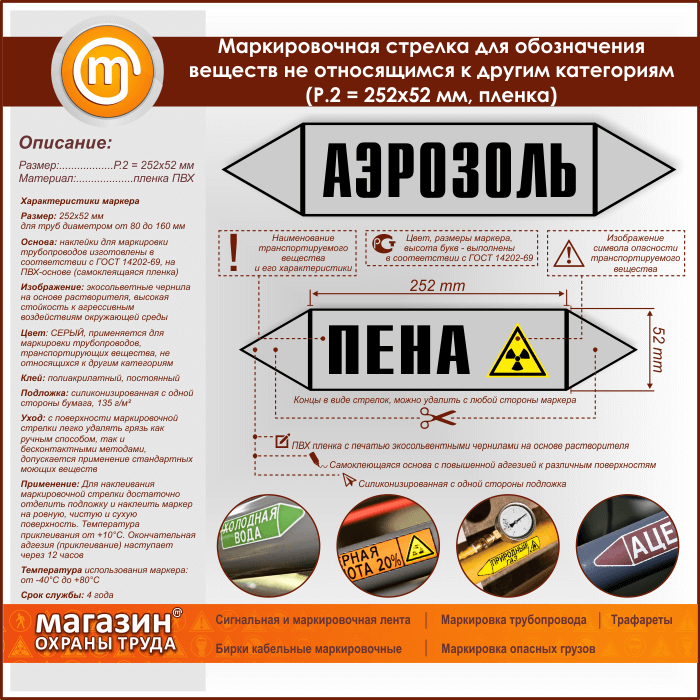 Самоклеящиеся маркеры «ПРОЧИЕ ВЕЩЕСТВА» имеют СЕРЫЙ цвет, который применяется для маркировки трубопроводов, транспортирующих вещества, не относящиеся к другим категориям. Наклейки размером 252х52 мм (Р.2) предназначены для маркировки труб диаметром от 80 до 160 мм. Изготовлены в соответствии с ГОСТ 14202-69 на самоклеящейся плёнке