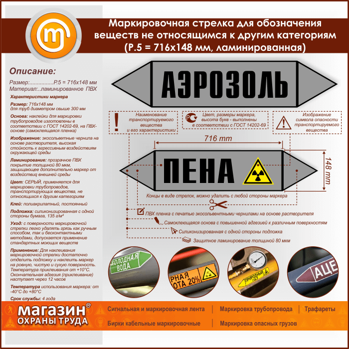 Самоклеящиеся маркеры «ПРОЧИЕ ВЕЩЕСТВА» имеют СЕРЫЙ цвет, который применяется для маркировки трубопроводов, транспортирующих вещества, не относящиеся к другим категориям. Наклейки размером 716х148 мм (Р.5) предназначены для маркировки труб диаметром более 300 мм. Изготовлены в соответствии с ГОСТ 14202-69 на самоклеящейся плёнке. Для дополнительной защиты маркера от воздействия агрессивной внешней среды мы производим ламинирование изображения толщиной 80 мкм