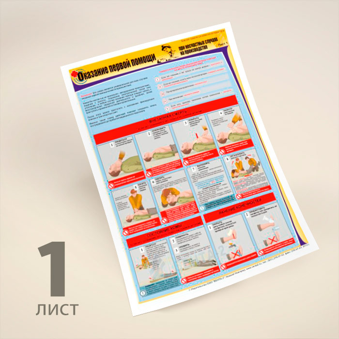 Комплект плакатов «Оказание первой помощи при несчастных случаях на производстве» из 3 листов может быть изготовлен любого формата и размера, на бумаге, самоклеящейся пленке, пластике, баннерной ткани и металле. Разрабатываем, рисуем и изготавливаем плакаты на любую интересующую Вас тематику