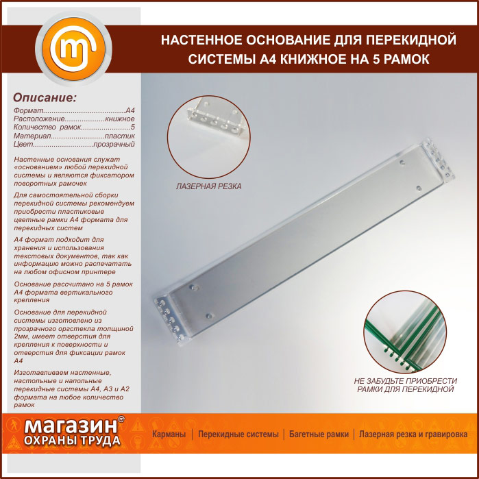 - Основание для перекидной системы изготовлено из прозрачного оргстекла толщиной 2 мм, имеет отверстия для крепления к поверхности и отверстия для фиксации рамок А4