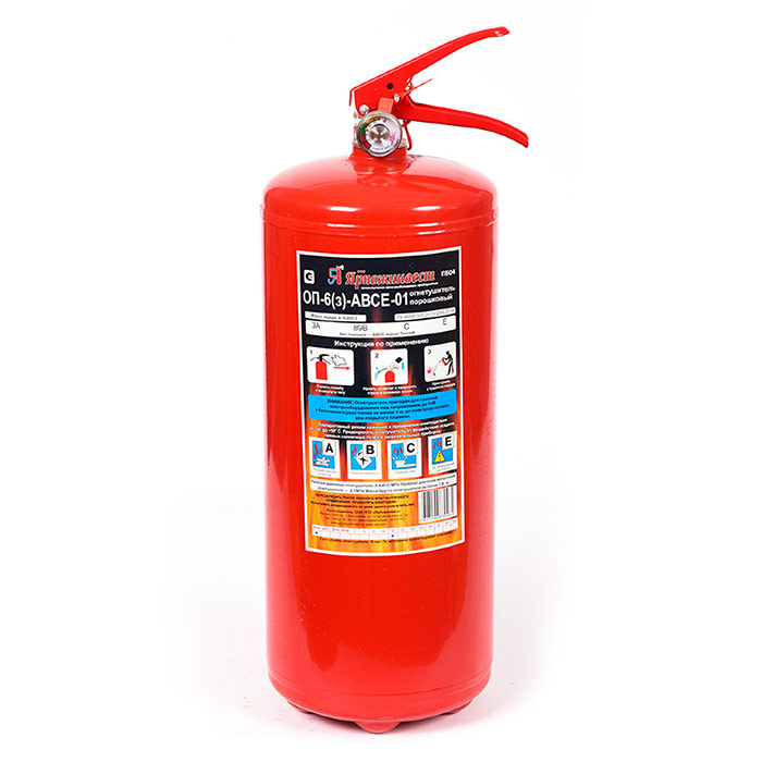 Переносной порошковый огнетушитель ОП-6(з) закачного типа (с манометром). Имеет типовое одобрение МРС. Рекомендуется для оснащения бытовых объектов (квартиры, дома, офисы, гостиницы и пр.), автомобилей и гаражей, противопожарных щитов. Порошковые огнетушители применяют для устранения очагов возгораний на транспорте, в жилых и общественных помещениях. Не подходит для тушения твердых веществ. ОП-6(з) рассчитан на тушение объекта возгорания в течение 12 сек. при длине струи 3 м. Ранг по модельным очагам: 89В, С, Е (до 1000В)