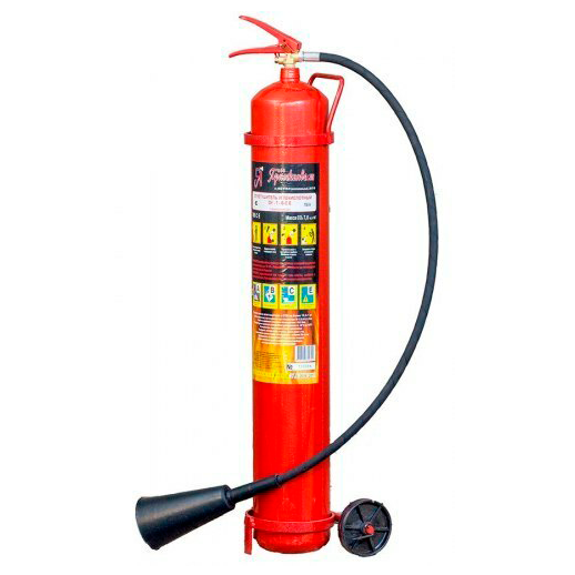 Передвижной углекислотный огнетушитель ОУ-10. Поставляется собранный. Предназначен для защиты объектов производственного и хозяйственного назначения, электроустановок под напряжением до 10 кВ. Вместимость корпуса составляет 13,4 л, масса заряда – 10 кг. Данный огнетушитель рассчитан на тушение объекта возгорания в течение 15 сек. при длине струи 4 м. Ранг по модельным очагам: 55В, С, Е (до 10000В)